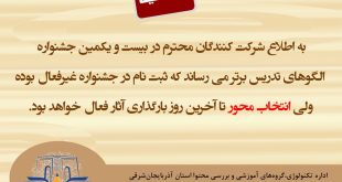 قابل توجه همکاران محترمی که هنوز در جشنواره ثبتنام نکردهاند: سایت جشنواره تا اطلاع ثانوی برای ثبتنام باز میباشد.